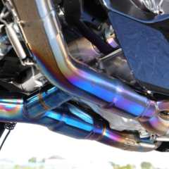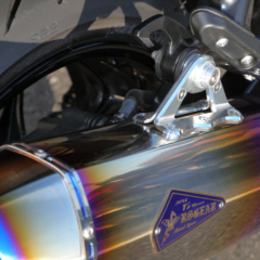 【アールズギア GTスペック チタンフルエキゾーストツインマフラー】●素材:チタン ●重量:7.2kg ●価格:38万5000円(チタンポリッシュ) 39万6000円(チタンドラッグブルー) ※写真はプロトタイプ