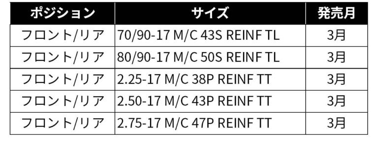 サイズラインナップは、全て前後兼用で以下の通りだ。