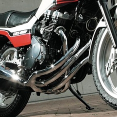 【クロスマフラーをオプション設定】エキゾーストパイプが"X"を描くCBX[写真右]ならではのマフラーを新規作成、当時流行った集合管の細身のサイレンサーも再現。これ、現行SFユーザーも普通に欲しくなるカタチかも。