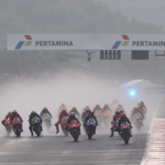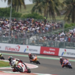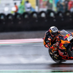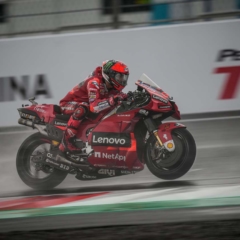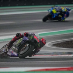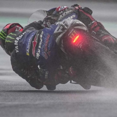 ウエット路面とは思えないバンク角で走るライダーたち。今回のクアルタラロ選手は、自身でも驚いたというほどの好ペースだった。