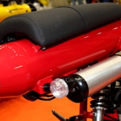 ヘッドランプはガンナーのトップモデルだけにLEDライトを装備。テールランプも筒型の車体にピッタリ収まる丸型。車体右下の銀色の筒はエアクリーナーケースだ。