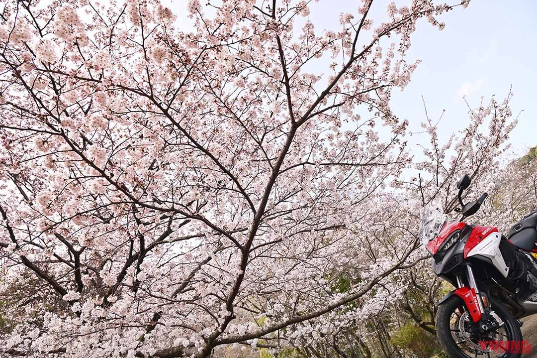 狩野川さくら公園は伊豆の国市にある公園で、その名の通り桜並木がキレイなことで知られている。ムルティストラーダで宿を出て、桜を探しながら向かったのだが、道中のソメイヨシノは「2〜3分咲き」といった感じ。もう少し咲いていてほしい! と桜を探しながら結局、狩野川さくら公園まで着いてしまった。おおっ、結構咲いている!