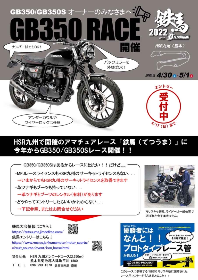 鉄フレームに単気筒~4気筒以上のエンジンを搭載するモーターサイクル「鉄馬」のために行われるアマチュアレースがHSR九州(熊本県)。エントリーしやすいクラス分けも特徴のひとつだが、その中に注目の新設クラスがある。ホンダが2021年に発売して大人気となっている単気筒マシン、GB350&GB350Sを対象としたワンメイクの『GB350/GB350Sレース』である。