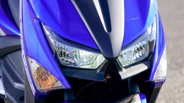 【250ccのXMAXを思わせる逆スラントLEDライト】ヘッドライトは1灯から逆スラントの2灯式となり、フロントウインカーはボディマウントに。テールランプはLED 面発光で、中央がブレーキランプ。