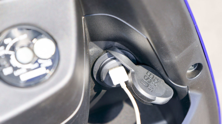 12VのDCジャックは時代のニーズに合わせてUSBソケットに変更。下のフロントポケットは500mlのペットボトルが収納できるサイズだ。