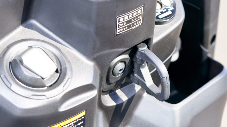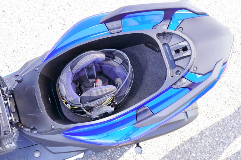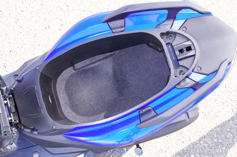 Xの約29Lから約28Lと容量が微減したシート下トランク。ヘルメットは逆さまに入れる方式に。グラブバーは分割式を継承。