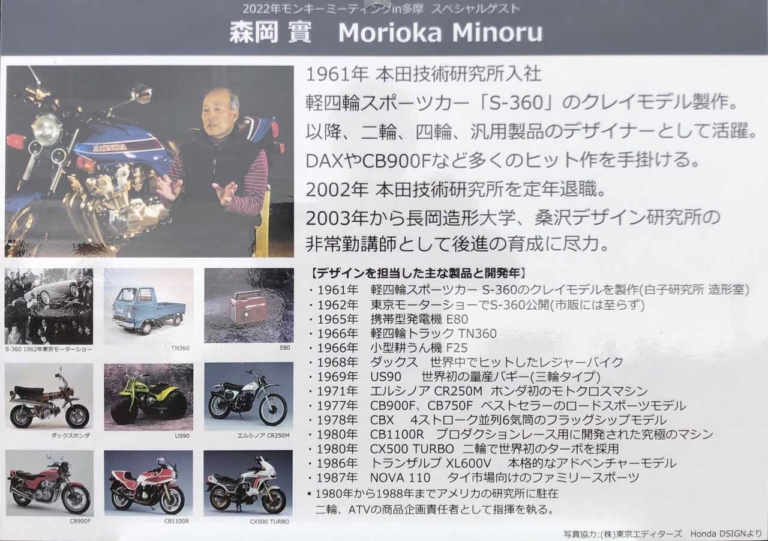 2022年4月24日に東京サマーランドで開催された「第13回モンキーミーティング in 多摩」にて、新型ダックス125の展示とともに、本田技術研究所で初代ダックスをデザインした森岡 實さんのトークショーが行われた。トークショー後のインタビューも交え、蘇ったダックスが何を継承したのか探ってみた。