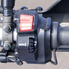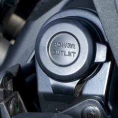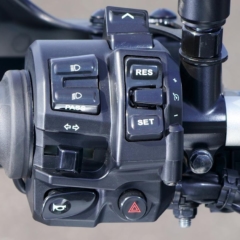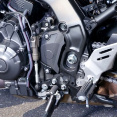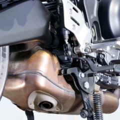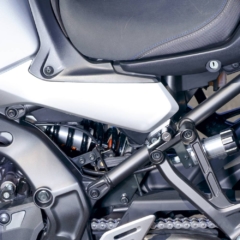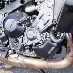 ストロークを3mm伸ばして845→888ccとし、最高出力は116→120psとなった水冷並列3気筒エンジン。ショートボックスマフラーは左右に排気口がある。