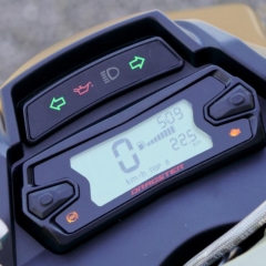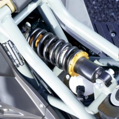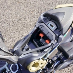 デザイン優先でシート下スペースはほぼ皆無。ETC車載器とウエスくらいは入るが雨具は入らないといった程度。赤いキャップは診断プラグ。
