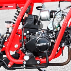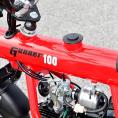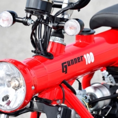 【PHOENIX ENGINEERING GUNNER100】■全長1670 全高1270 軸距1150 シート高802(各mm) 車重80kg ■空冷4スト単気筒SOHC2バルブ 97cc 最高出力/トルク:未発表 変速機4速リターン 燃料タンク容量3.5L ■ブレーキF=ディスク R=ディスク ■タイヤF=100/90-12 R=120/70-12 ●色:赤 青 黄 緑 白 黒 ●価格:29万4800円