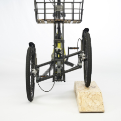 シンプルかつ軽量な前2輪構造。上下2本のアームが左右輪を懸架し、バンクすると前輪も傾き、ハンドルを切れば舵角も発生。ハの字型のバネはバンクした車体を直立に戻すためのもので、サスペンション機能はない。