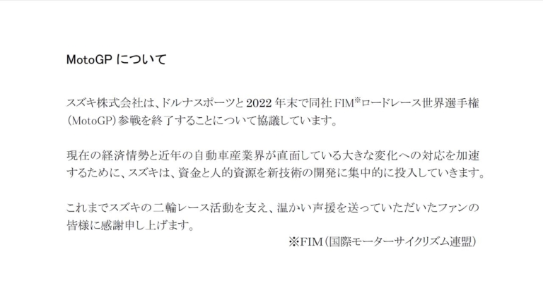 そんな中での、突然の撤退の報。まさか、と思ったが、スズキから公式リリースが出され、もはや確定事項のようだ。
