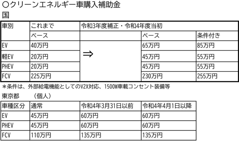 また、個々のEV車に対する補助額も令和3年度補正予算・令和4年度当初予算から増額されています。表のように、EVは40万円から65万円または85万円に、軽EVとPHEVは20万円から45万円または55万円に、燃料電池車は255万円から230万円または55万円となりました。