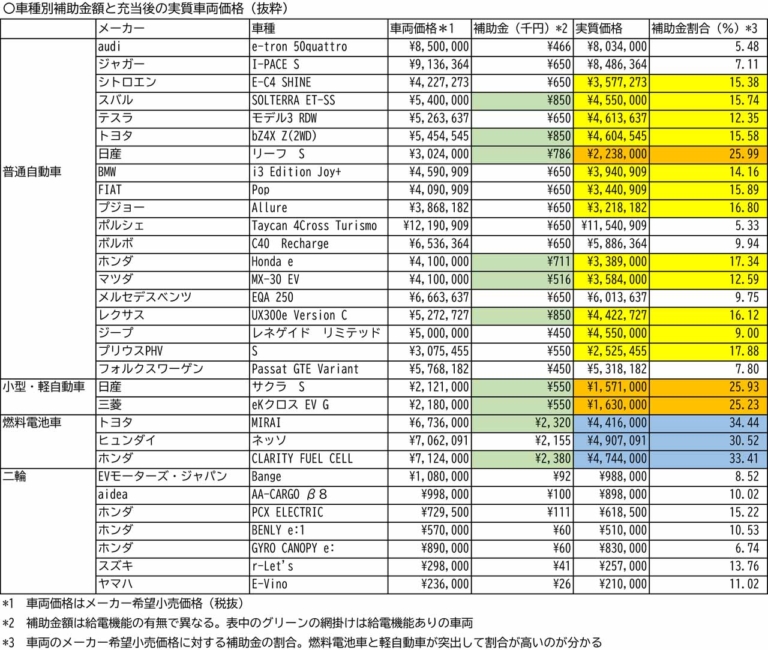 車両価格に対する補助金の%を計算してみたところ、補助金額が最も多い燃料電池車を除くと軽自動車と、この4月に価格を大幅に改定(値下げ)した日産のリーフが突出して割合が多いことが分かる。車種によって補助金額が違うのは、燃費(航続距離といったほうがいいかも)などさまざまな条件を満たす、満たさないで変わってくるのだそうだ。これもとても分かりにくい……。