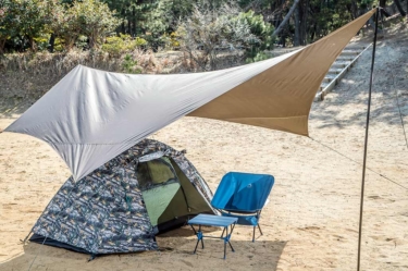 タープは意外とコンパクト。これならバイクにも積める 設営してみるとそのサイズに圧倒されるタープだが、収納サイズはソロ用のテントとほとんど変わることはない。なお、強風時は設営をあきらめた方が無難だ。 防[…]