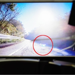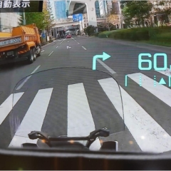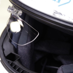 チンガード右上部の穴からプロジェクターのように映像を照射し、透明なHUDに情報が映る。クルマのHUDと原理は同じだ。