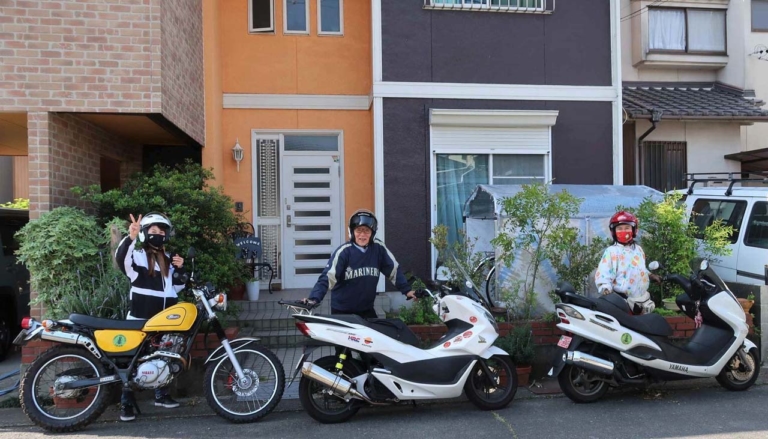 今年、普通免許を取得して伊藤さんがプレゼントしたヤマハ・ブロンコに乗り始めた千恵さん(左端)、同じくヤマハのマジェスティ125に乗る娘の由子さん(右端)と(伊藤さんはセカンドバイクのホンダ・PCX125)。親子孫3代のバイクライフを楽しんでいる。