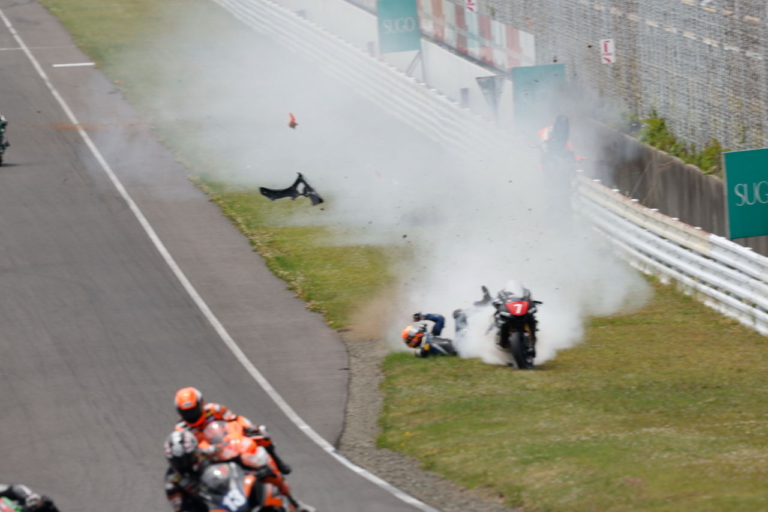 このアクシデントで3人が転倒しているのですが、まずは、10%勾配を登り切ったところで谷本音虹郎がウイリーで単独転倒。谷本はイン側に、マシンはアウト側にすべっていき、アウト側に避けてしまった前田が、ほぼグラベルに出たところで谷本のマシンと接触。オイルクーラーを破損し、白煙を吐きながらグラベルを疾走。スピードを落とせない状態のため飛び降りたといいます。一方、谷本のマシンは跳ね返ってイン側に戻ってしまい鈴木孝志に接触。一瞬火が出る大惨事になってしまっていました。前田は右手首を骨折。鈴木は両手、骨盤骨折と重傷でしたが、命に別状がなかったのが不幸中の幸いでした。このアクシデントのきっかけとなった谷本は、所属するドッグファイトレーシングの8番ピット辺りまで滑っていきましたが大きなケガはありませんでした。