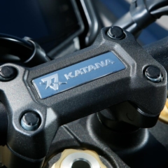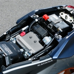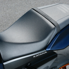 【SUZUKI KATANA】■全長2130 全高1100 軸距1460 シート高825(各mm)車重215kg■水冷4スト4気筒DOHC4バルブ 998cc 150ps/11000rpm 10.7kg-m/9250rpm 変速機6段リターン 燃料タンク容量12L ■ブレーキF=ディスク R=ディスク■タイヤF=120/70ZR17 R=190/50ZR17 ●色:銀 マット紺 ●価格:160万6000円