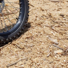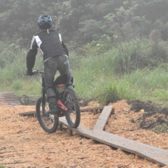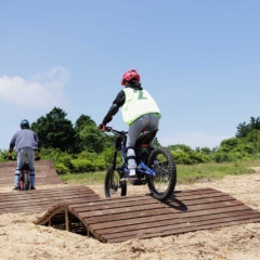 段差をつけたパレットの上に丸太を敷いたパレットトレイル。重心をうまく使う必要があり、オフ走行の基本を体感できる。