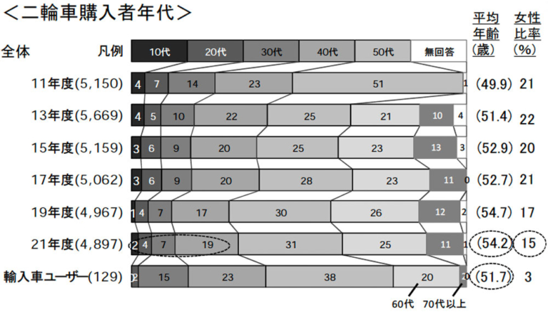 今回、一般社団法人 日本自動車工業会の行った2021年度の市場動向調査でも、50ccスクーターの平均年齢は56.7歳(うち女性38%)に対し、251~400ccオンロードバイクの平均年齢は46.4歳(うち女性7%)と実に10歳の差異(女性の割合は31ポイントもの差)がある。つまり、二輪車ユーザーの中でもどちらかと言うと移動手段が主をする50ccスクーターユーザーを統計に入れてもなお上記の表からわかるように、二輪車ユーザーの全体平均年齢が54.7歳から54.2歳へ下がったという調査結果から、おそらく普通二輪クラスだけでも、さらに中古で購入しているユーザーを含めると実際はもっと若いユーザーが動いているのではないだろうか。