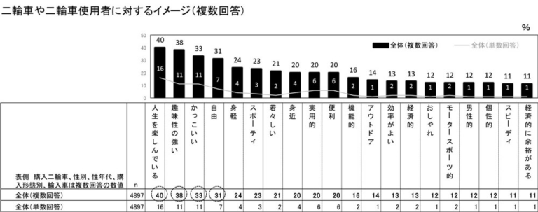 また、同3位の「趣味性の強い」が2位に浮上しており、バイクのイメージ向上はもちろんのこと、特にバイク使用者に対するイメージが向上している。
