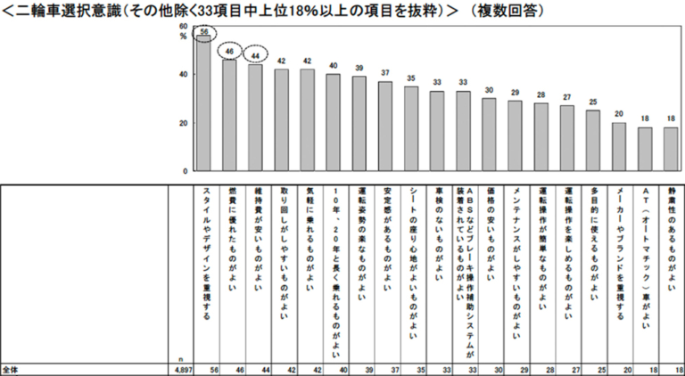今も昔もバイクの魅力はなんといってもカッコよさ。二輪車市場動向調査の結果でもバイクを選択する際に最も意識するのは「スタイルやデザイン」という結果が出ている。