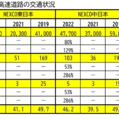 NEXCO各社がGW明けの5月9日にリリースした、休日割引適用外となった今年のGWの渋滞データは、コロナ禍だった昨年(2021年)との比較ではなく、コロナ禍以前の2019年が比較対象(2021年は参考データとして公表)。確かに2019年よりは渋滞が減少しているように見えるが、最大渋滞長は東日本、西日本とも2022年のほうが長く、日にちによっては深刻な渋滞が生じていたことも分かる。