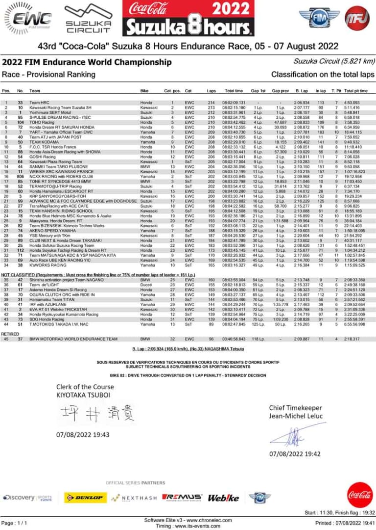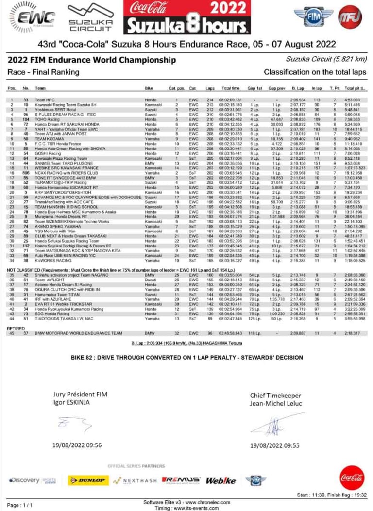 FIM 世界耐久選手権 2022年鈴鹿8耐 テクニカルコントロール後の最終順位表