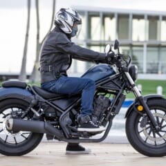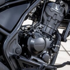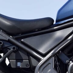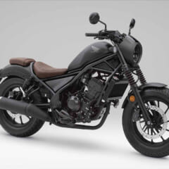 【HONDA Rebel250】車体中央をくびれさせた細身のスタイルに、存在感のある太い前後タイヤが外観上のポイント。ブラックアウトされ統一された各部の仕上げも特徴だ。ビキニカウルやダイヤモンドステッチ入りシート、フォークブーツなどを装備したSエディション(右)も設定される。