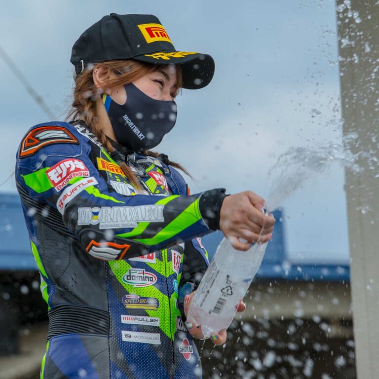 終盤に#3岸野選手が転倒するも、追われる金子さんは気づかず、ミスせず走ることに専念してクラストップでチェッカー! 見事、夢の表彰台に立つこととなった。ちなみに予選の1分21秒390から、決勝ラストで1分20秒954のベストラップを叩き出した。