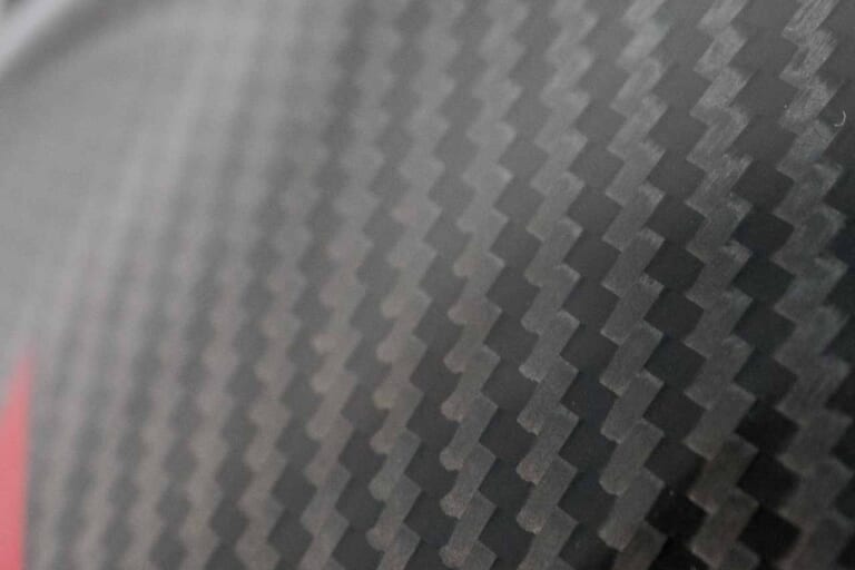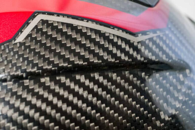 ドライカーボンは曲がりのある部分でもカーボン目がよれずに均一になるのが特徴。ヘルメット中央に型の合わせ目がありますが、他の部分は均一で美しいカーボン柄を確認することができます。