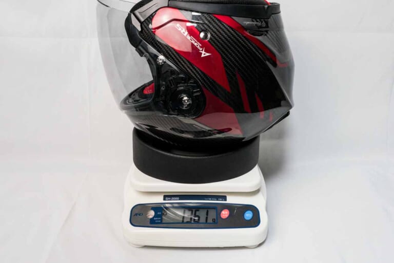 A FORCE RS JETの重さを測定してみると1361gでした。typeCはカーボン単色モデルと比べて差し色が入っている分重くなり、インナーバイザーも5mm長いため、少し重くなっています。