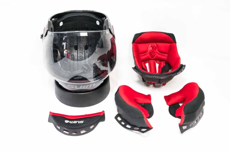 内装はトップ、チークパッド左右、ネックカーテンの4点が取り外し可能です。今回はMサイズをお借りしましたが、帽体が共通ということもあり、各部のクッションは厚め。