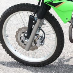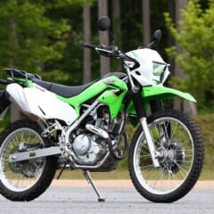 【KAWASAKI KLX230 S】■全長2080 全高1110 軸距1360 シート高830(各mm) 車重136kg ■水冷4スト単気筒SOHC2バルブ 232cc 19ps/7600rpm 1.9kg-m/6100rpm 変速機6段リターン 燃料タンク容量7.4L ■ブレーキF=ディスク R=ディスク ■タイヤF=2.75-21 R=4.10-18 ●色:緑 濃緑 ●価格:50万6000円