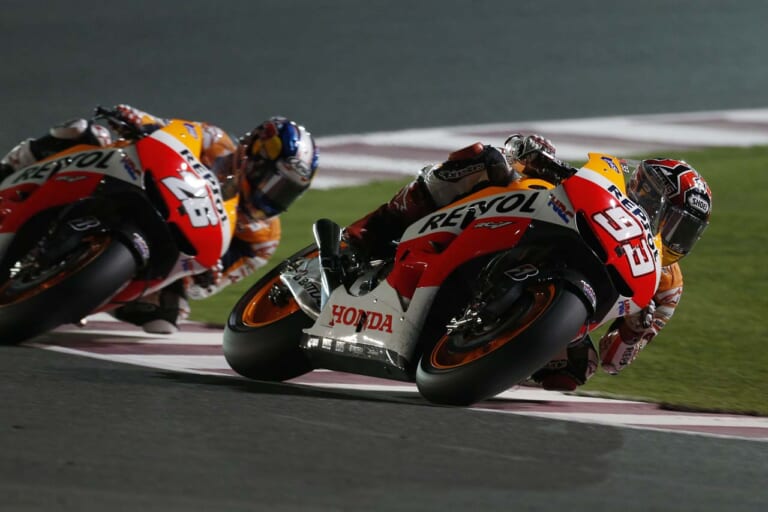 そして2013年シーズンは、前年までと同じくカタールで開幕。このレースで優勝したのは、前年に最高峰クラスで自身2度目の最高峰クラスタイトルを獲得した、ヤマハワークスチームのホルヘ・ロレンソ選手でした。ロレンソ選手は、2度目のウインターテストやカタールGPのプラクティスでもロングランを実施していて、マシンの仕上がりがいいことをうかがわせていましたが、開幕戦ではまさにその通りの結果に。そして2位にはロッシ選手、3位にはなんとマルケス選手が入賞しました。マルケス選手は、同じホンダワークスチームから参戦するダニ・ペドロサ選手をラスト6周でパスして2番手に浮上。一方でロッシ選手は、予選7番手かつレース序盤にコースアウトして出遅れながら中盤以降に追い上げ、ラスト4周のところでペドロサ選手を抜いて3番手にポジションを上げると、マルケス選手に迫りました。
