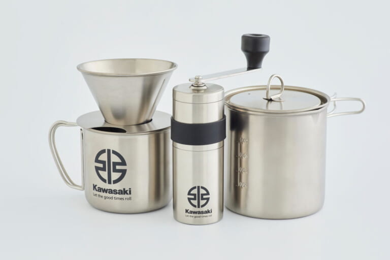 また、カワサキでは野外で気軽に簡単にコーヒーを楽しめる、カワサキロゴ入り『アウトドアコーヒーセット』を抽選で30人にプレゼントするキャンペーンも実施中。セット内容はコーヒーミル、ドリッパー、カップ、クッカーで、専用収納袋も付属する。摩擦熱が起きにくく、金属臭がしないセラミック刃を採用したコーヒーミルで淹れるコーヒーは味、香りともに格別だ。ぜひこの機会に応募して、カワサキのマシンと共にアウトドアでのコーヒーを楽しもう。