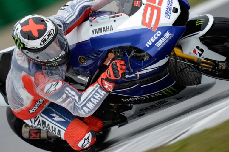そしてこの年、マルケス選手はルーキーとしては会心のレースを続けます。第3戦スペインGPで2位、第4戦フランスGPでは3位。第5戦イタリアGPは2番手走行中に転倒してリタイヤに終わりましたが、第6戦カタルニアGPでは再び3位で表彰台に立ちました。この勢いに対抗するのはペドロサ選手と、前年の覇者でヤマハワークスチームから参戦していたホルヘ・ロレンソ選手。マルケス選手がイタリアGPでノーポイントに終わったこともあり、カタルニア終了時点ではペドロサ選手が123点でランキングトップに立ち、ロレンソ選手が116点、マルケス選手が93点という状況でした。