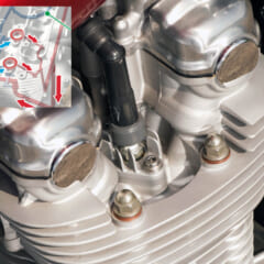 排気ポート周辺から点火プラグ座面を通過するオイル通路を設け、オイルクーラーで冷やしたオイルを導入することで燃焼室の温度を下げる機構(小写真参照)を持つCB1100。プラグ周辺のフィンが立ったパーツは、このオイル通路のフタなのだ。