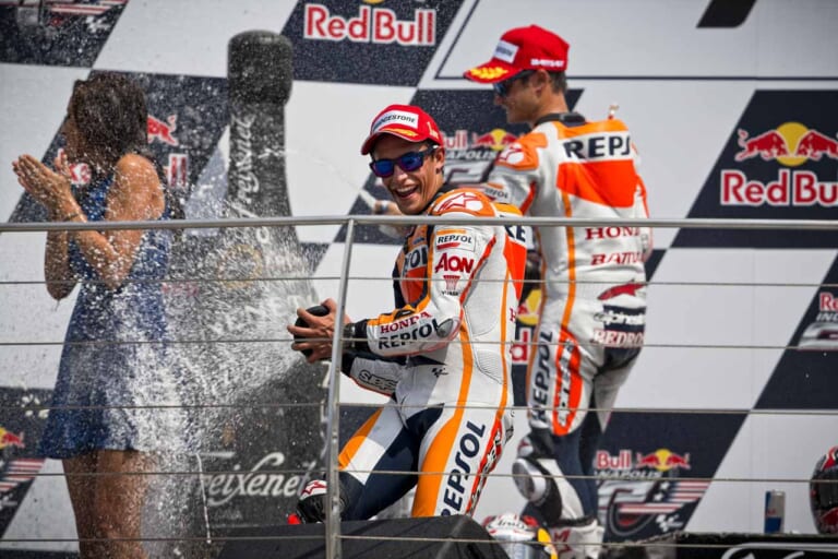 2013年のMotoGPは、この年にステップアップしてきたホンダワークスチームのマルク・マルケス選手が、シーズン中盤に第8戦ドイツGP、第9戦アメリカズGP、第10戦インディアナポリスGP、第11戦チェコGPと4連勝。これでチームメイトだったダニ・ペドロサ選手と26点差、ヤマハワークスチームのホルヘ・ロレンソ選手とは44点差までリードを拡大しました。その後、ロレンソ選手が第12戦イギリスGPと第13戦サンマリノGPで勝利してやや巻き返し、この2戦をロレンソ選手はいずれも2位、ペドロサ選手は3位でフィニッシュ。第14戦アラゴンGPでは、マルケス選手とペドロサ選手がレース中に接触し、これでペドロサ選手のトラクションコントロール用センサーケーブルが切断され、ペドロサ選手はハイサイド転倒によりリタイヤに終わりました。