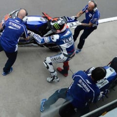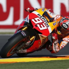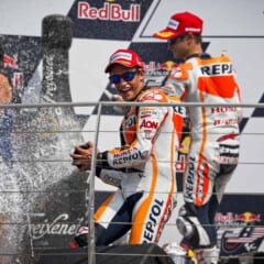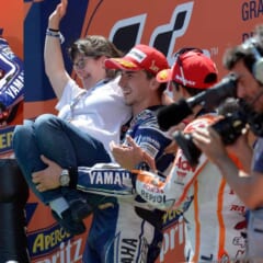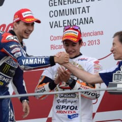 優勝したロレンソ選手と、4位でタイトルを決めたマルケス選手。大胆に上半身を落とし込んで肘を擦るライディングフォームは、その後のMotoGPでスタンダードになっていった。