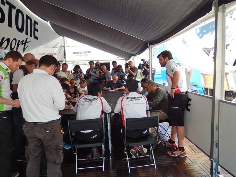 ドルナとの協議に加えて、ほぼ同時期にホンダレーシング(HRC)とヤマハを訪問して、上層部に決定事項を報告。また、2月上旬にはマレーシアテストがあったので、ドゥカティと翌年からのレギュラー参戦が予定されていたスズキ、ホンダとヤマハにももう一度、この話をしました。その後、ドルナとはいつ発表をするか協議して、ヨーロッパラウンドの初戦となるヘレスサーキットでの第4戦スペインGPがいいだろう……と。そして、2014年5月1日の木曜日、現地時間の11時にプレスリリースを配信し、14時からブリヂストンのホスピタリティで会見を実施しました。