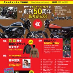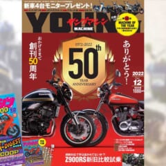 ヤングマシン2022年12月号は10月24日発売! おかげさまで本誌は創刊50周年を迎えました。巻頭特集では、同じく50周年のカワサキ『Z』の最新作・Z900RSを徹底解剖。Z650RS×ヨシムラのスクープも! 創刊年から開催しているマシン・オブ・ザ・イヤーも50回目になりました。誌面を見て応募した方に新車モニタープレゼントのチャンス! 過去49年分の上位ランキングも振り返ります。別冊付録は、創刊 […]