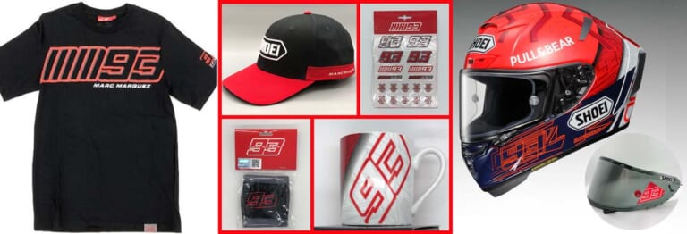 特別仕様セットの内容は、ヘルメット本体のほかにティアオフフィルム付きCWR-Fダークスモークシールド、オリジナルTシャツ(サイズ指定不可)、MM93キャップ、ステッカー、リストバンド、マグカップの7点。さらに、このうちの6点にマルケス選手が直筆サインを入れてくれるというスペシャルな特典がついている。マルク・マルケス選手のファンにとって、いずれも永久保存のマストアイテムとなること必至だ。