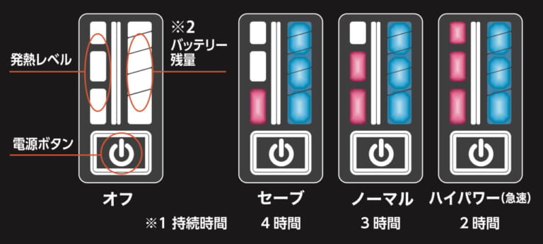 温度調整は3段階。ハイパワー(目盛り三本)で約2時間、ノーマル(二本)で約3時間、セーブ(一本)で約4時間の使用が可能だ。 ※セット品バッテリー(2,200mAh)の場合