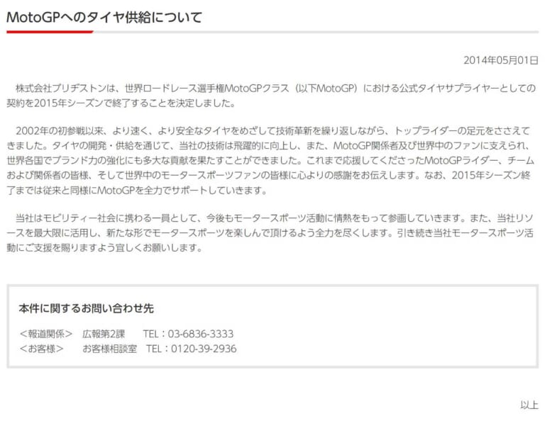 2014年5月1日の木曜日、ヘレスサーキットでの第4戦スペインGPでブリヂストンはMotoGPからの撤退を正式発表。当然ながらこれには、多方面からさまざまな反応や意見がありました。当時参戦していたメーカー(ホンダ、ヤマハ、ドゥカティ)および2015年から復帰予定だったスズキには、正式発表よりも前に詳細を伝えてありましたが、彼らは「残念だけど、しょうがないですね」というような感じでした。今年(2022年)は、スズキがMotoGPから急遽撤退することを決めて騒動にもなりましたが、当然ながらどのバイクメーカーもレース参戦するにあたり莫大な予算をつぎ込んでいて、MotoGPにおけるブリヂストンと同じように、費用対効果のことなど悩みをいくつも抱えているものです。