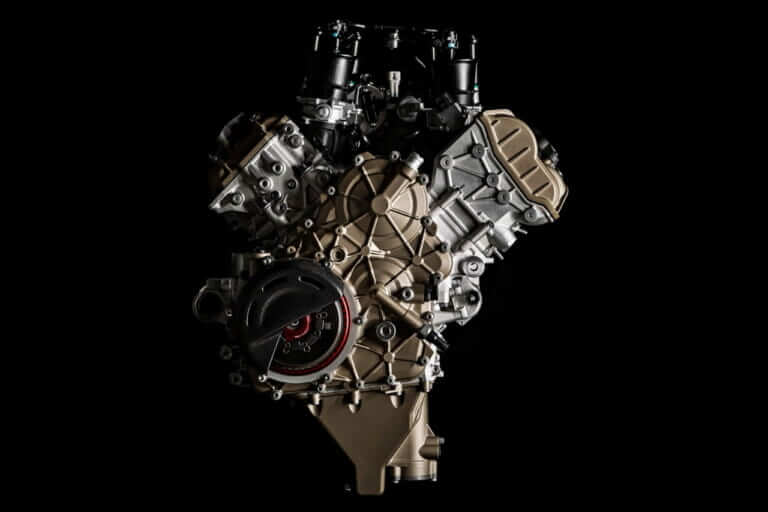 ドゥカティ「スーパーレッジェーラV4」が搭載する998ccのV型4気筒エンジン・デスモセディチストラダーレRは、MotoGPマシン「デスモセディチGP」と同じ逆回転クランクや軸配置、ボア×ストロークまで同じ(パニガーレV4/Sは1103cc)。それだけでなく、ドゥカティのアイデンティティであったL型2気筒エンジンの脈動を再現するかのような70度のクランクピンオフセット+90度のVバンクの“ツインパルス”点火シークエンスも再現している。