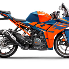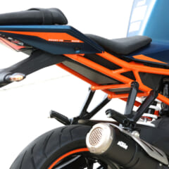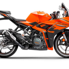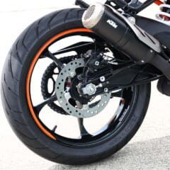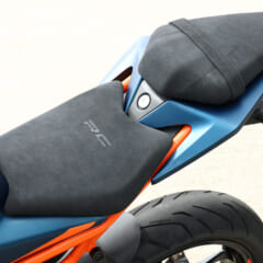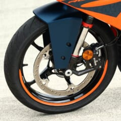 【KTM RC390】■軸距1343 シート高824(各mm) 乾燥重量155kg ■水冷4スト単気筒DOHC4バルブ 373cc 内径89×行程60mm 最高出力44ps/9000rpm 最大トルク3.77kg-m/7000rpm 変速機6段 燃料タンク容量13.7L ■キャスター23.5° ■ブレーキF=ディスク R=ディスク タイヤサイズF=110/70R17 R=150/60R17 ●色:ブルー×オレンジ オレンジ×ブラック ●価格:83万円