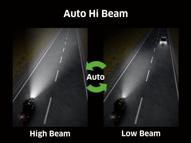 オートハイビームは、カメラセンサーを利用して前方の走行車両や街灯などの明るさを評価し、状況に応じて自動的にハイビーム/ロービームを切り替える機能だ。このシステムは、調光/追い越し設定をハイビームにし、夜間などの暗い環境のなか20km/h以上で走行すると作動する。システムONの時には、6.5インチTFTメーターに緑色のアイコンが表示され、ライダーに知らせてくれる。