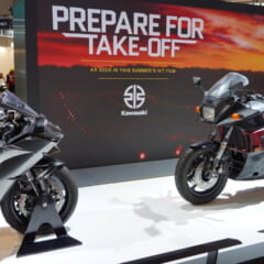 左が件の説明ボード。一部意訳を含むが、「映画のためにモディファイ──1984年式のカワサキGPz900Rニンジャは、新世代水冷4気筒の最初のモーターサイクル。カワサキはこのスーパーバイク=GPzを用いて再び量産車世界最速の座を手にした。36年後の続編映画(トップガン マーヴェリック)に帰ってきたGPz900Rは、スタジオアーティストの手により36年の時間が経ったことを表現する処理がなされた。もっとも有名な映画のアイコニックなモーターサイクル、カワサキニンジャとしてふさわしい姿に」といったことが書かれている。右は今回のEICMAで展示されたマーヴェリック号だ。